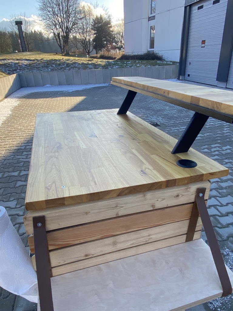 - b) einseitige Tischfunktion für zB. Sektempfang links, sowie Kastenpräsentation rechts