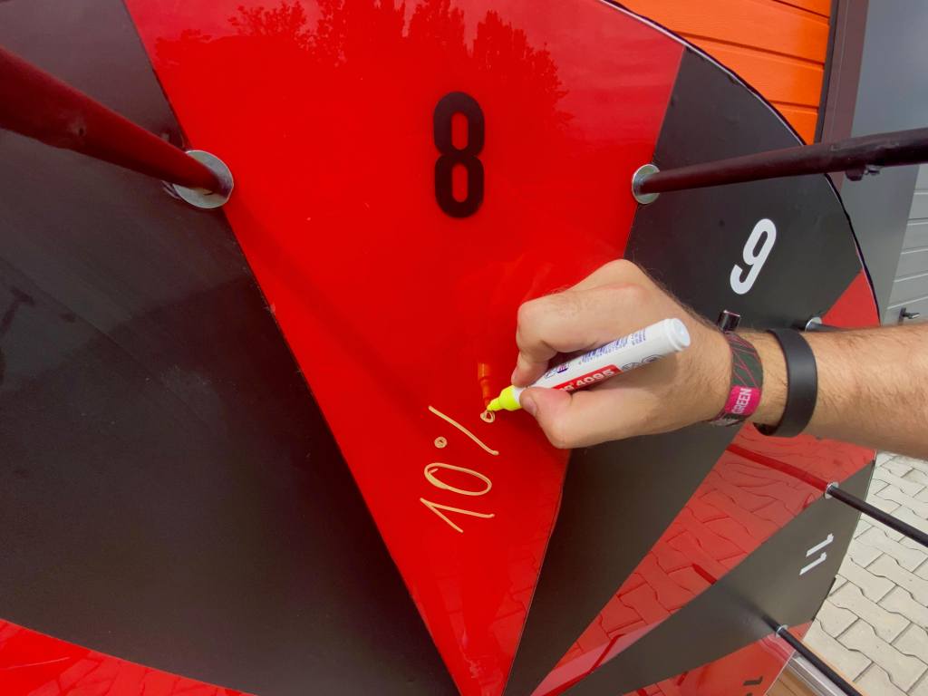 - Drehscheibe individuell beschreibbar. (Hauptgewinn, 20% Rabatt, Nochmal drehen, …)